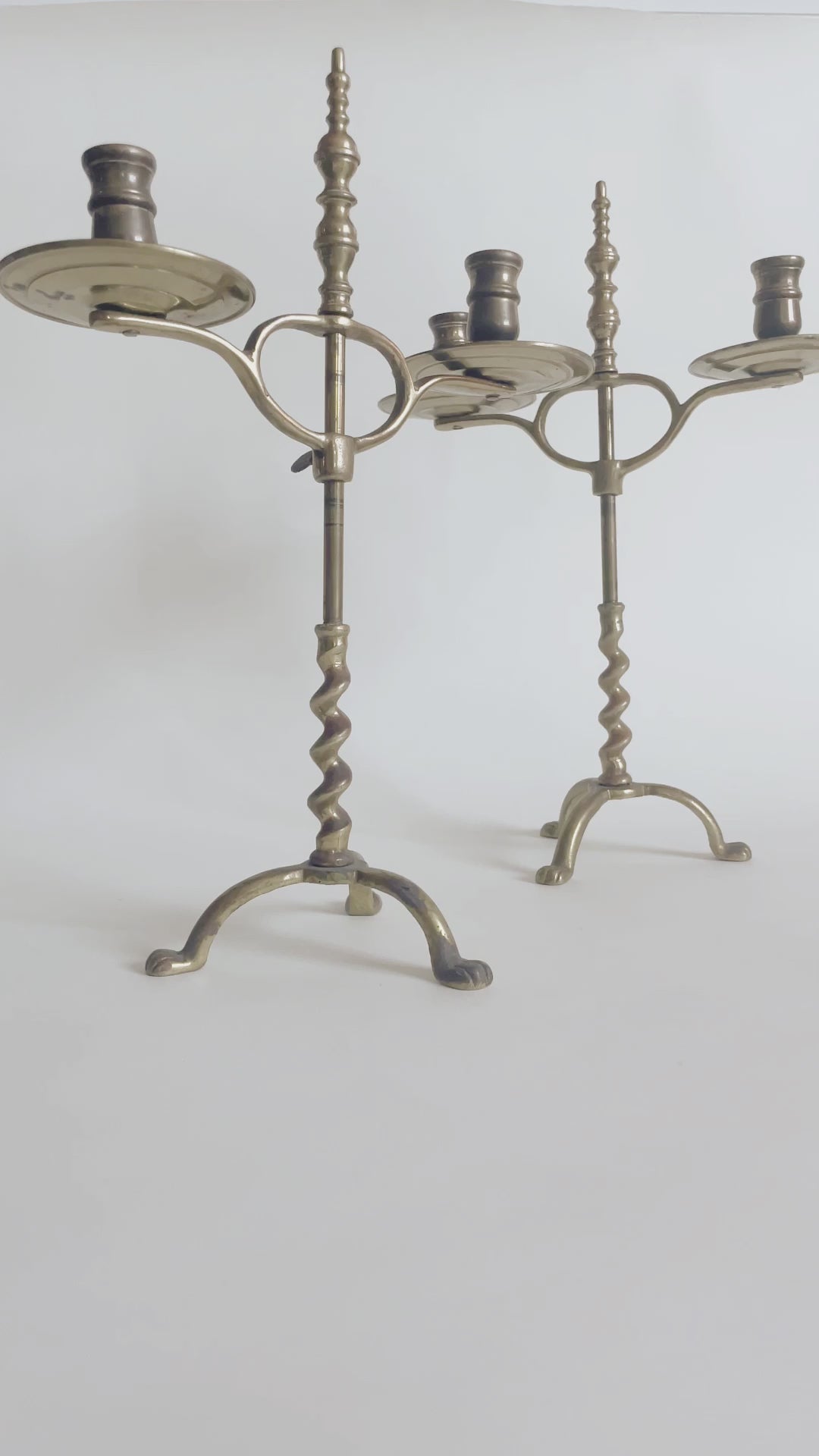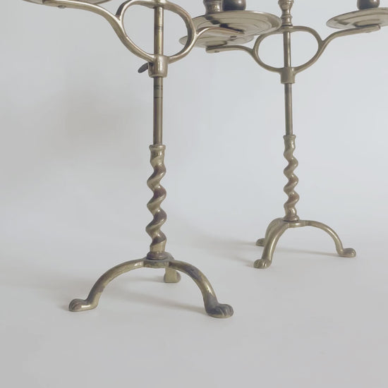Pair of early 19th century brass candleholders with adjustable heights. Each features brass feet and twisted details. Each measures 15" by 11". Price is for the pair.