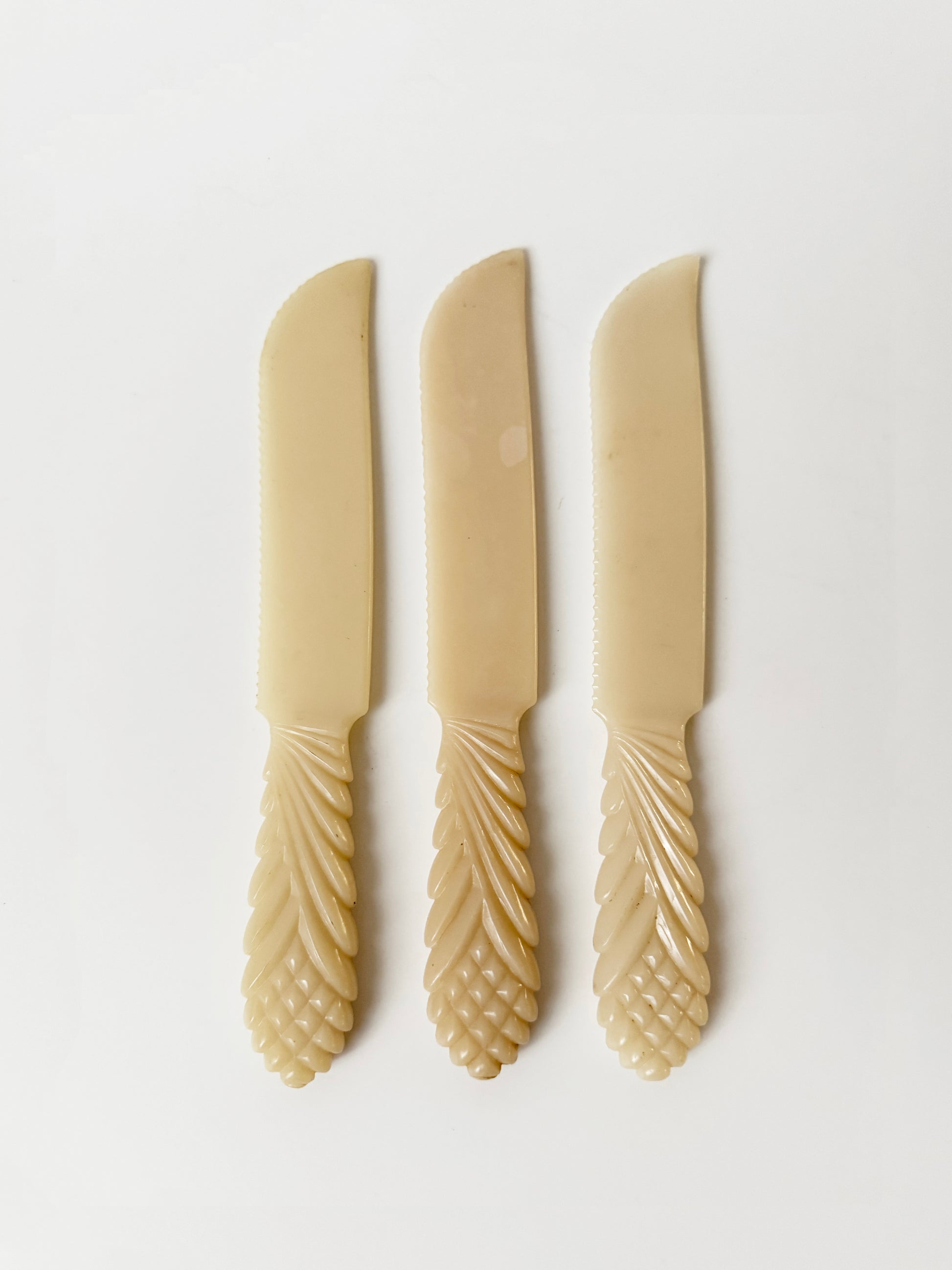 Set of three celluloid knives ca. 1950s. Each is approximately 9" long.