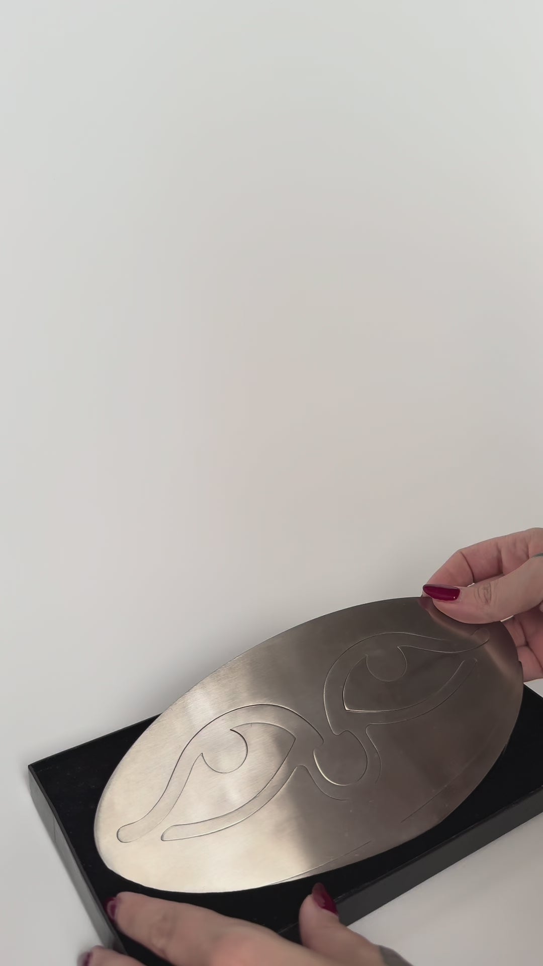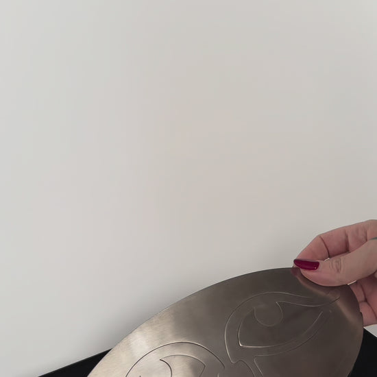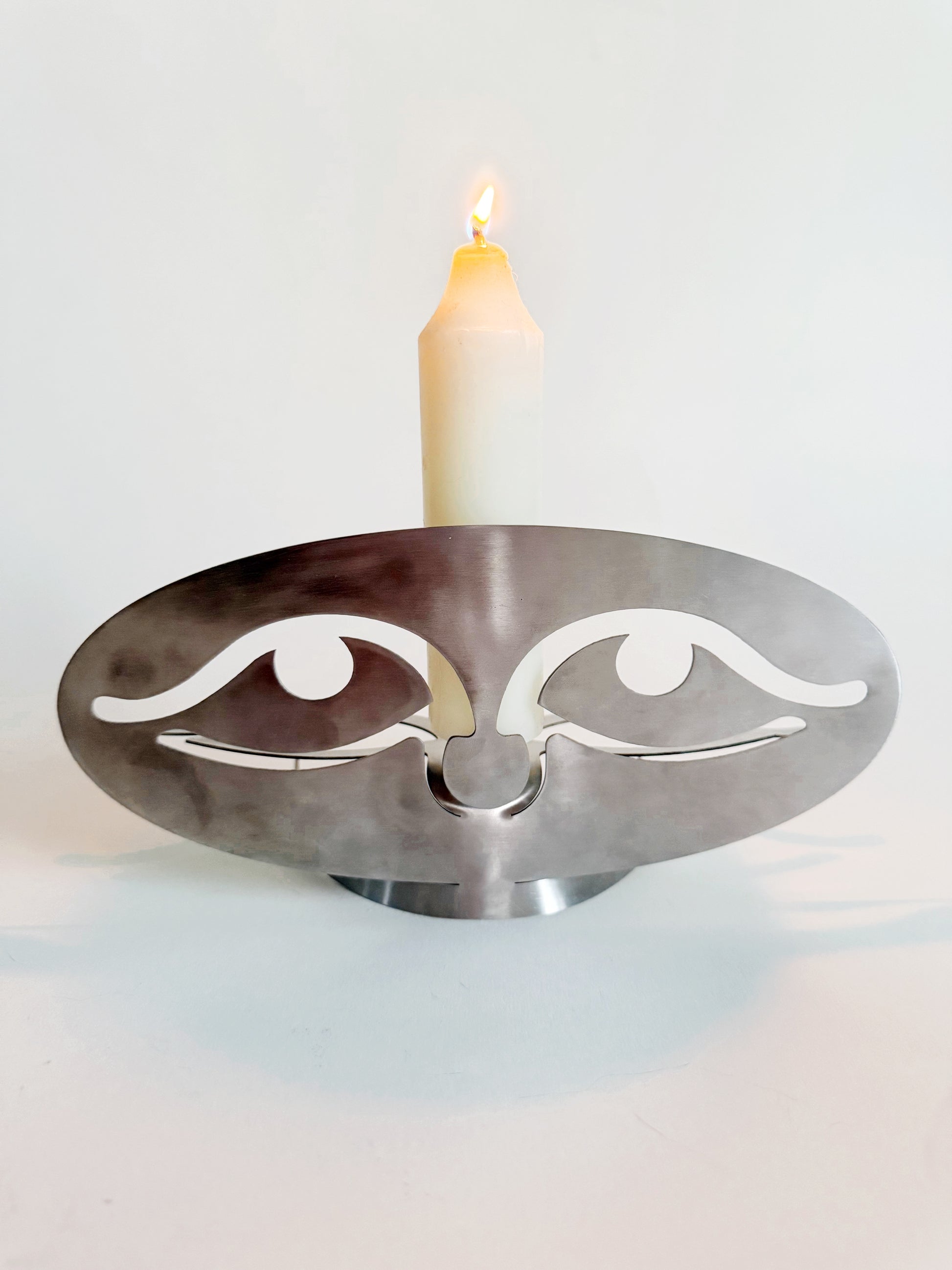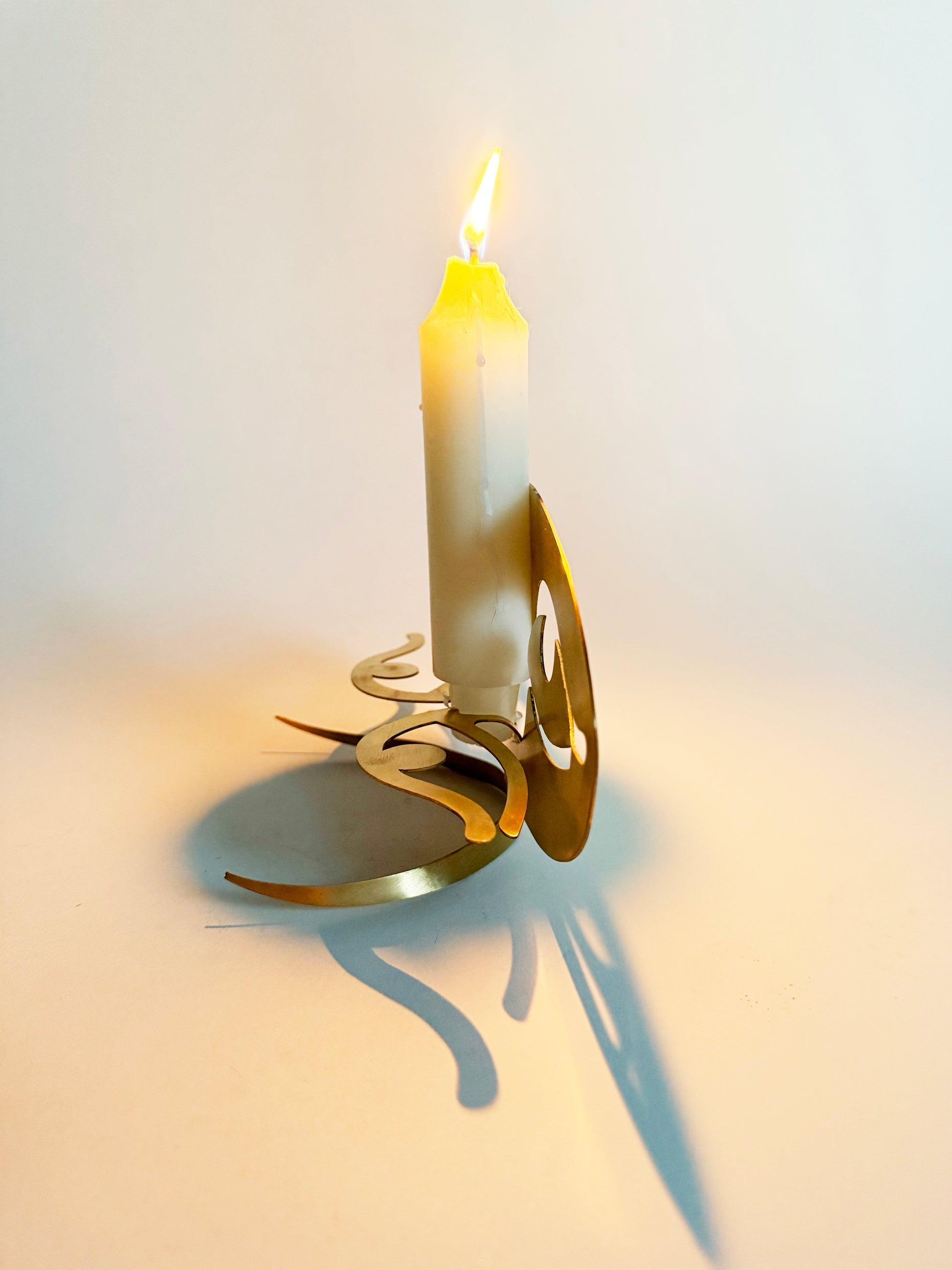 There have always been unsettling undertones of glorifying women's purity and control in Catholicism, and this story is a good example. But what really stood out to me is Lucia's taking matters into her own hands. I've been on my own journey of individuation by means of reclaiming and reframing a lot of the things that were presented to me since I was young, specifically in religion. To me, these eyes are a powerful symbol of our duality; of both devotion and defiance. The flame above the eyes or head is a common way artists would depict divinity or holiness, so a candle stand felt like a fitting form. The idea of reshaping and taking matters into one's own hands is mirrored in how it's assembled. The piece arrives in one flat sheet of brass or aluminum that the user has to bend and fold into shape.