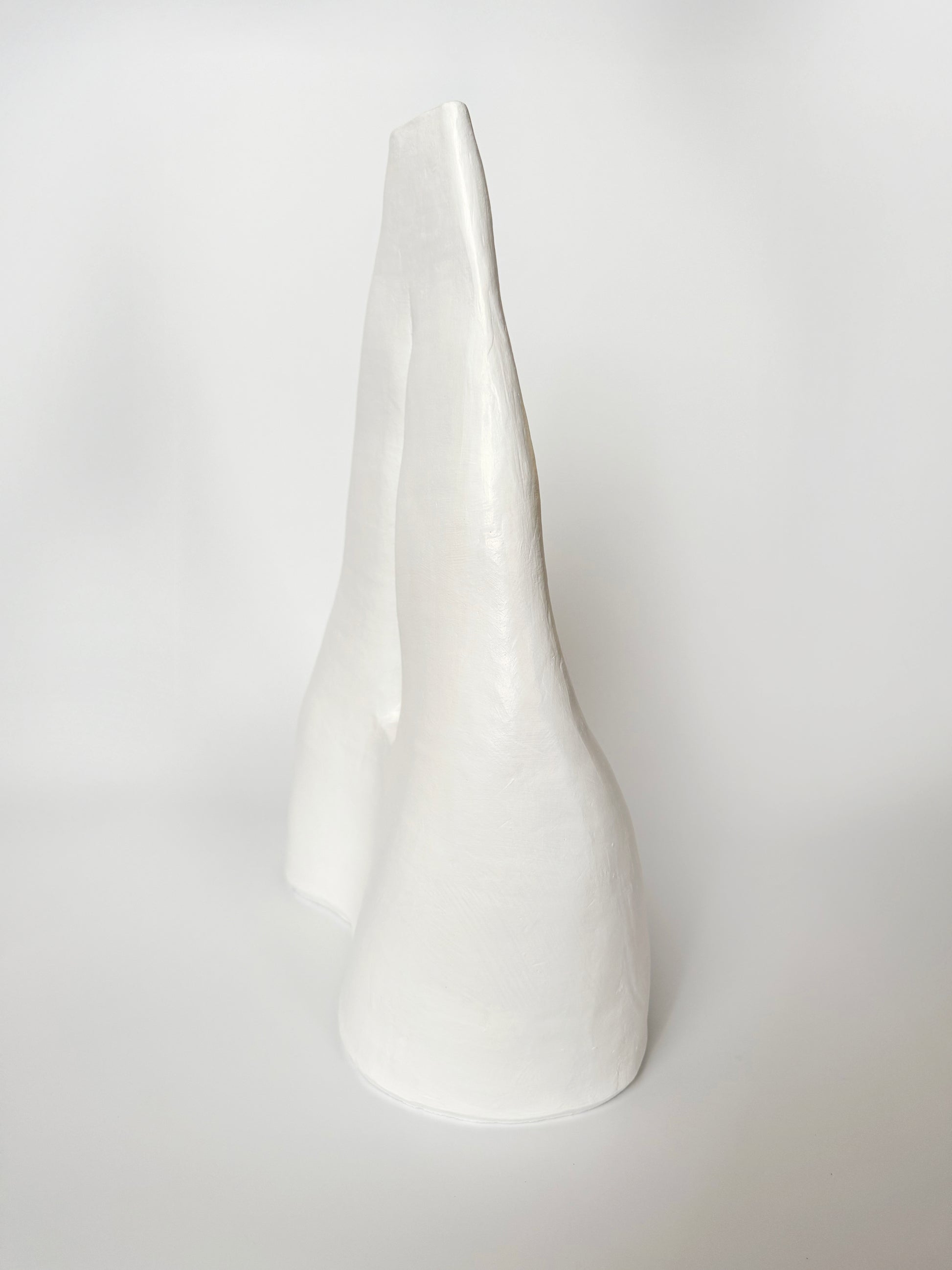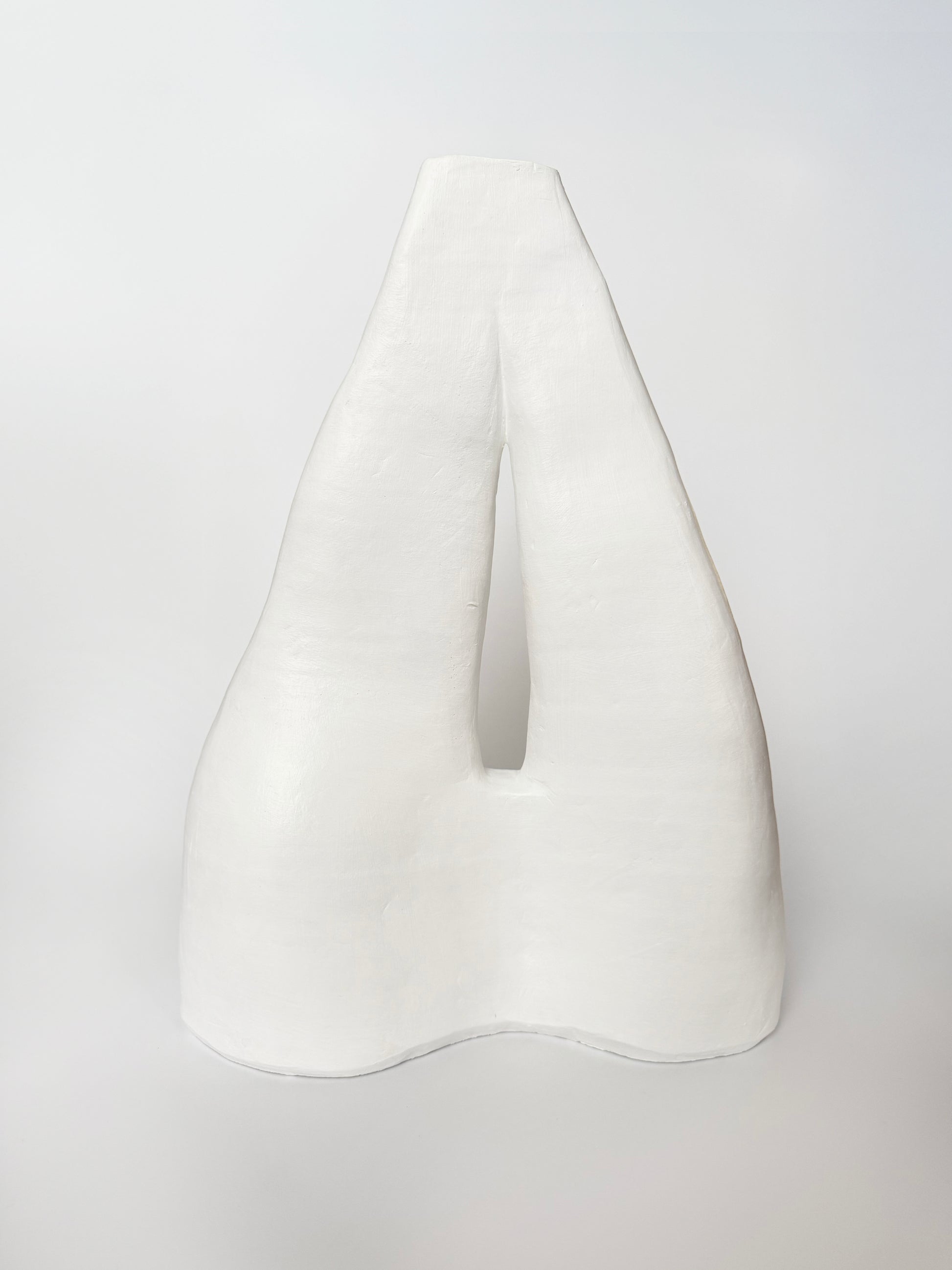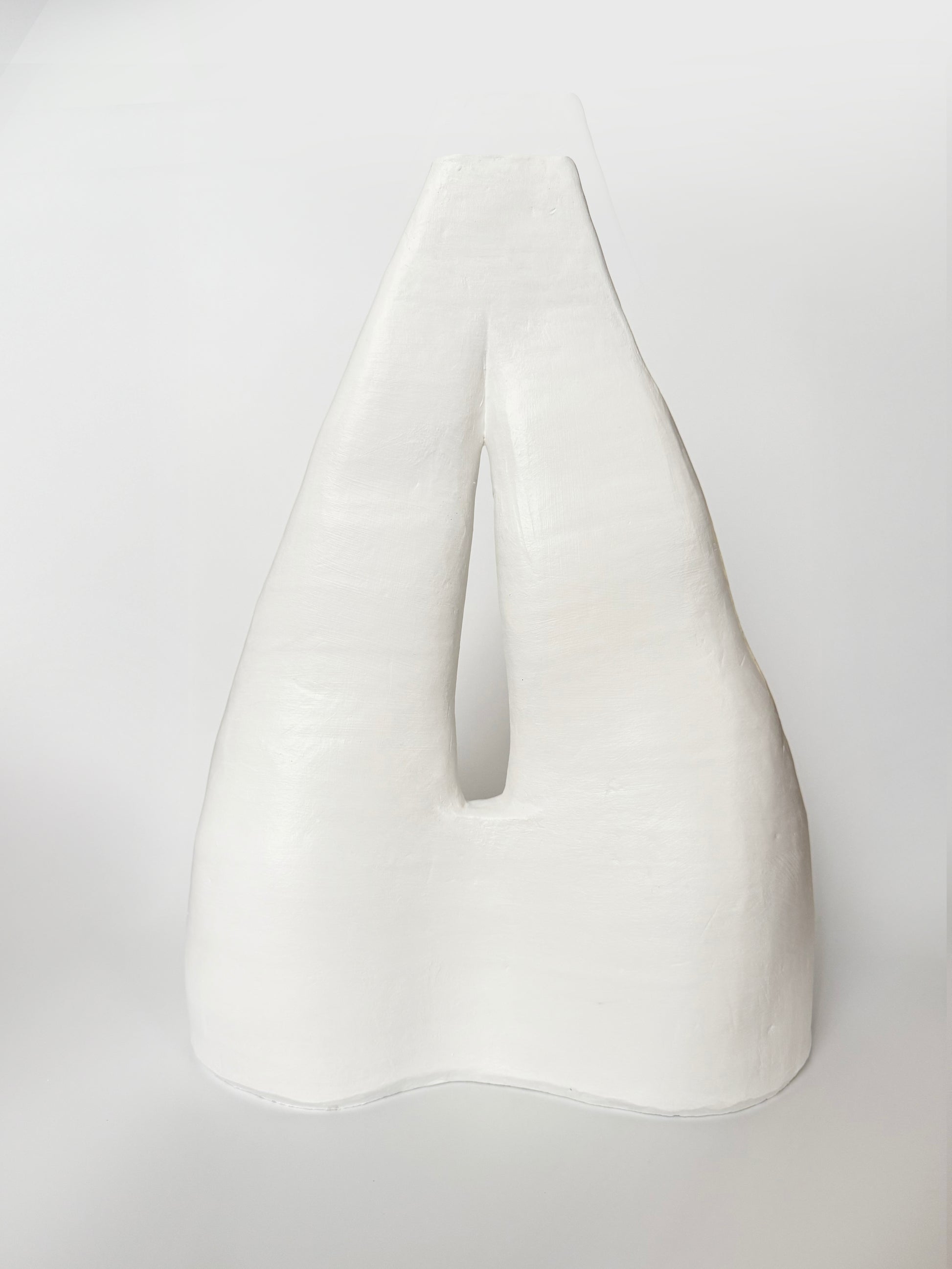 Massive handmade plaster vessel with very small slit opening, artist unknown. Measures 18" tall by 14" by 5".
